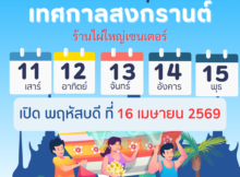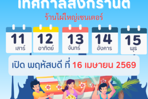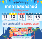 หยุดสงกรานต์ 11-15 เมษายน 2569 เปิดบริการ พฤหัสบดี ที่16 เมษายน ขอให้ทุกท่าน เที่ยวกับครอบครัว เพื่อน ๆ อย่างมีความสุข และปลอดภัยนะครับ